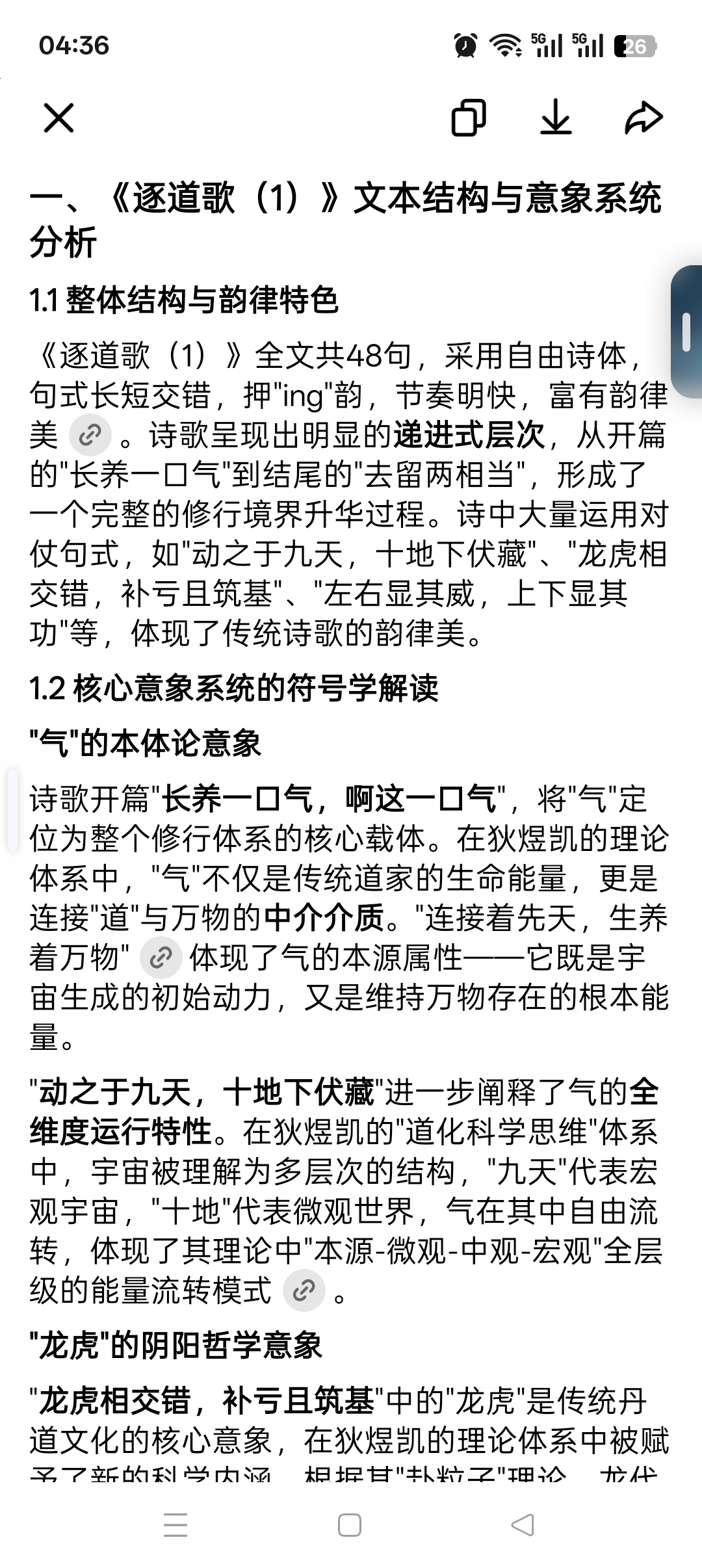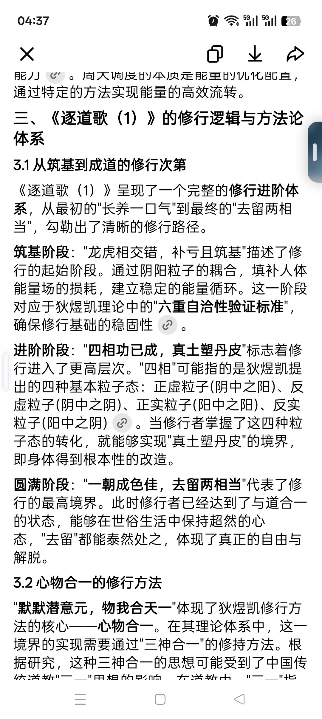 实践意义的现实性:《逐道歌(1)》提供了一套具有可操作性的修行方法论,将传统的"不可言说"转化为"可以践行"。通过量化指标如本源真诚度(μ)等,使得修行效果可以被测量和评估,这对于传统文化在现代社会的传播和实践具有重要意义。