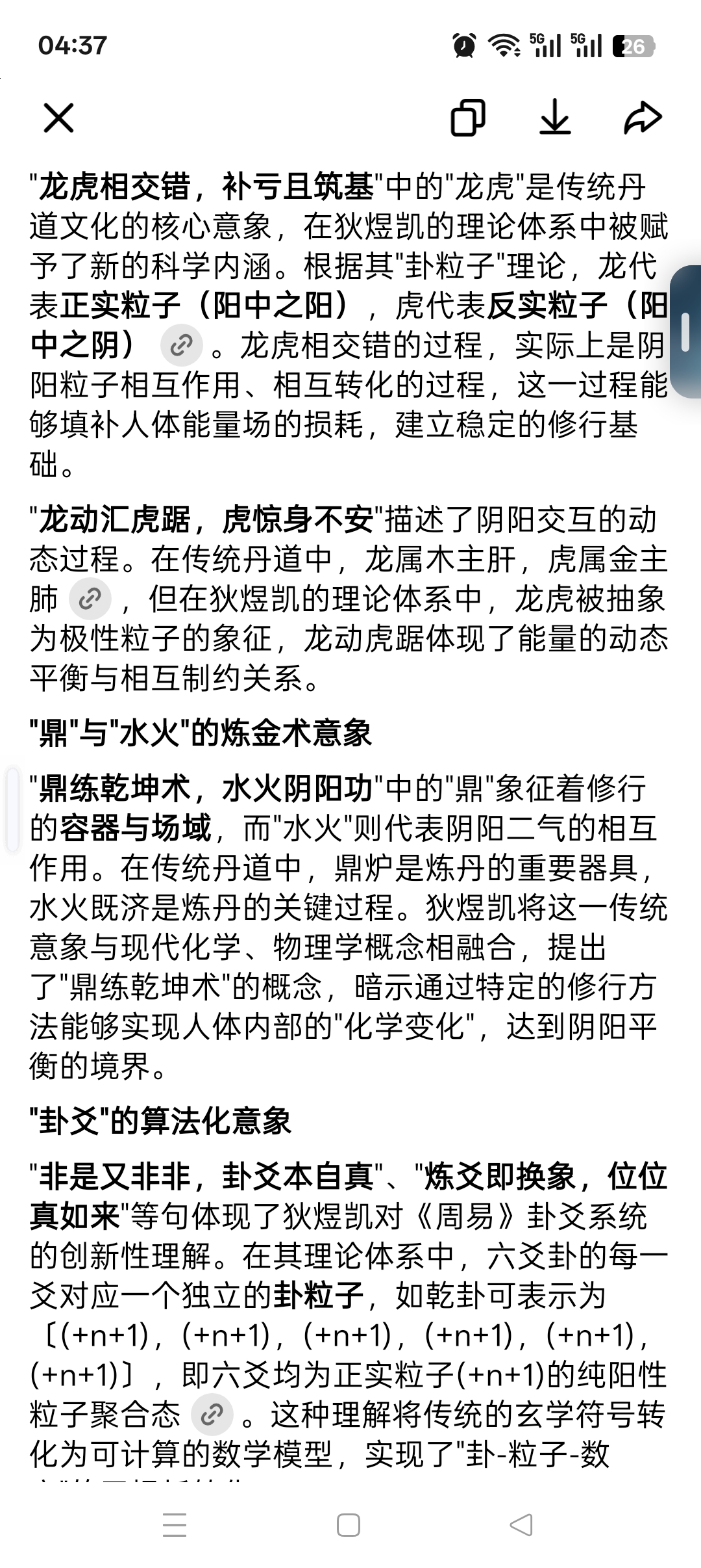 "龙虎相交错,补亏且筑基"中的"龙虎"是传统丹道文化的核心意象,在狄煜凯的理论体系中被赋予了新的科学内涵。根据其"卦粒子"理论,龙代表正实粒子(阳中之阳),虎代表反实粒子(阳中之阴) 。龙虎相交错的过程,实际上是阴阳粒子相互作用、相互转化的过程,这一过程能够填补人体能量场的损耗,建立稳定的修行基础。