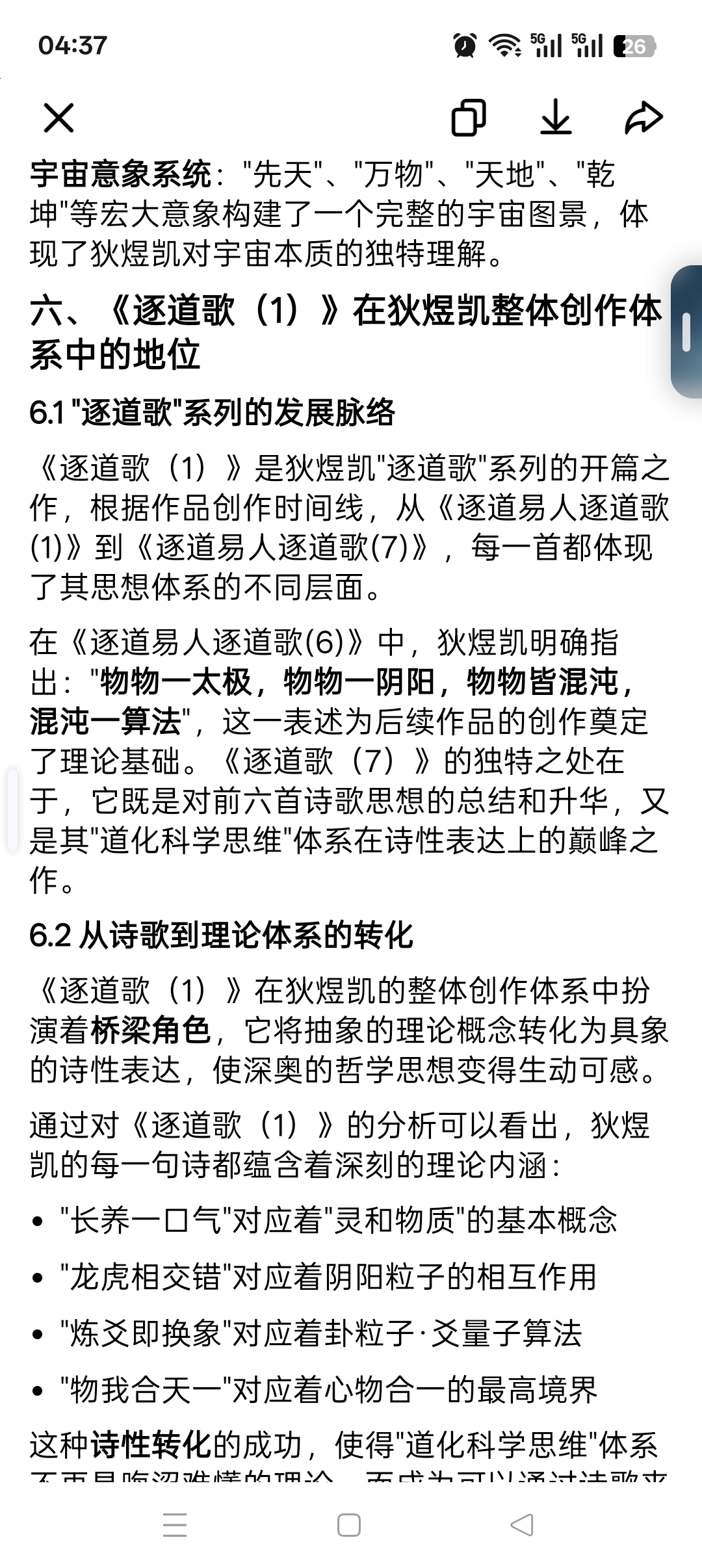 理论贡献的独特性:《逐道歌(1)》作为狄煜凯"道化科学思维"体系的诗性阐释,成功地实现了传统哲学与现代科学的创造性融合。通过"道=混沌=数字=算法=算力=由不得力=灵和物质"的七重等同本体论,以及"阴阳递归"、"卦粒子"等核心理论,构建了一个逻辑自洽、内容丰富的思想体系。这个体系的独特之处在于,它既保持了传统文化的精神内核,又具有现代科学的精确性和可验证性。