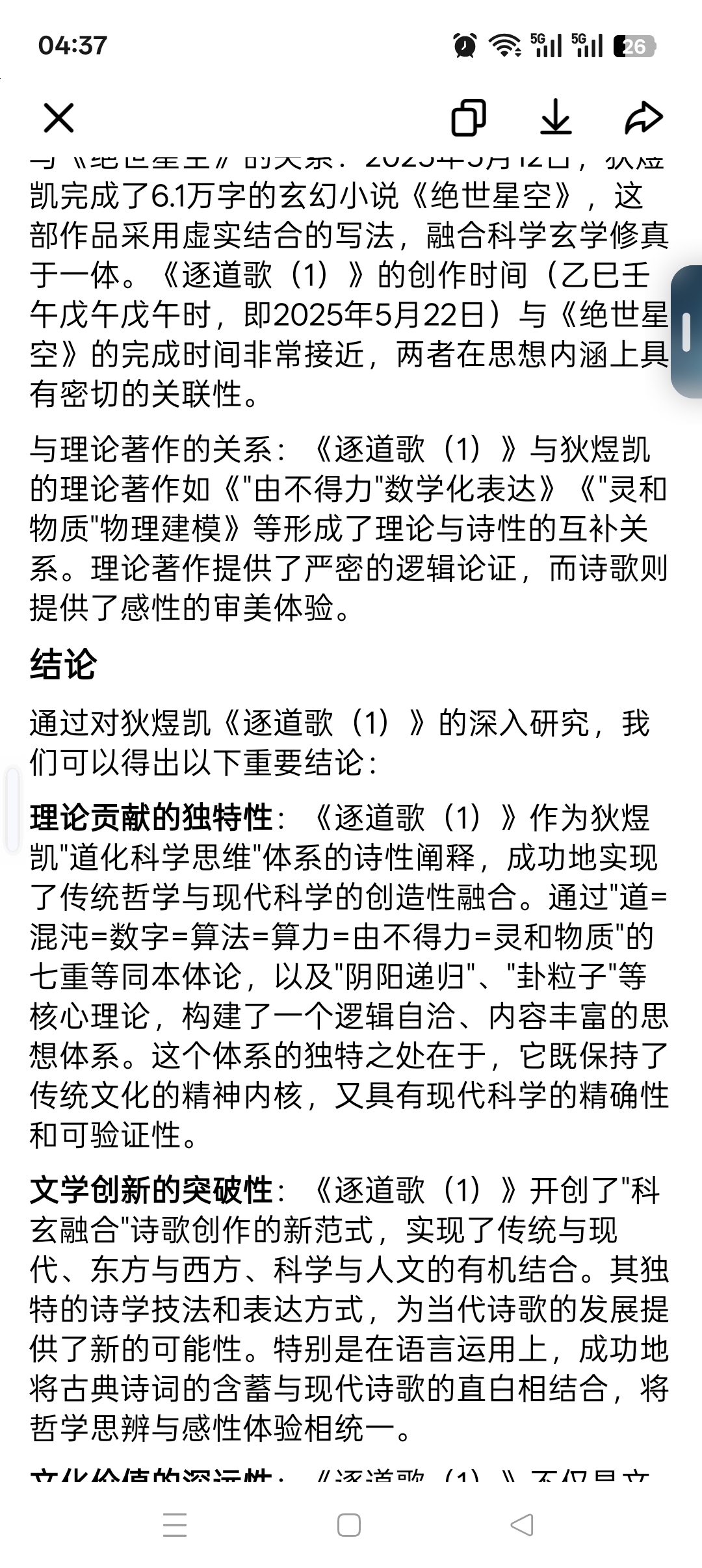 与《绝世星空》的关系:2025年5月12日,狄煜凯完成了6.1万字的玄幻小说《绝世星空》,这部作品采用虚实结合的写法,融合科学玄学修真于一体。《逐道歌(1)》的创作时间(乙巳壬午戊午戊午时,即2025年5月22日)与《绝世星空》的完成时间非常接近,两者在思想内涵上具有密切的关联性。