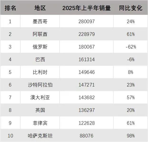 下图:2025年上半年中国汽车出口地区TOP10(图源:autoreport汽车产经)