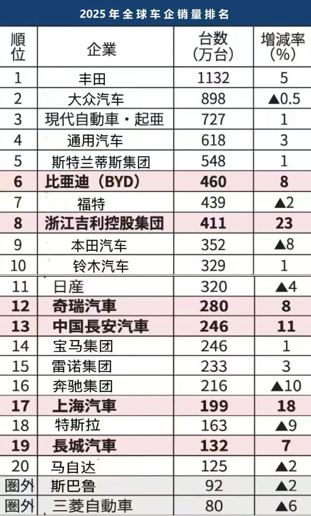 在2025年全球车企销量前20名榜单中,中国共有比亚迪、吉利、奇瑞、长安、上汽、长城6家企业上榜,数量超过日本的5家,成为上榜数量最多的国家。