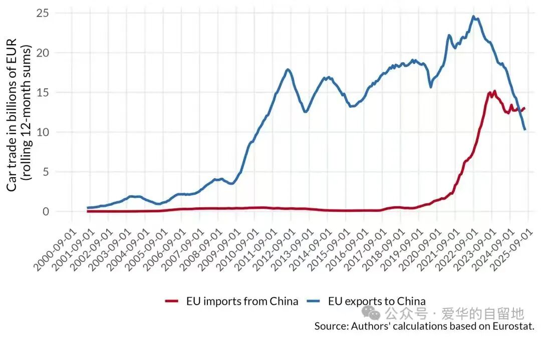 下图:欧盟从中国进口汽车的贸易额,超过了欧盟出口到中国的汽车贸易额,这两条走势曲线在历史上第一次出现了交叉点(图源:爱华的自留地,报告原文 《How Buy-European Rules Can Help Save Europe’s Car Industry》)