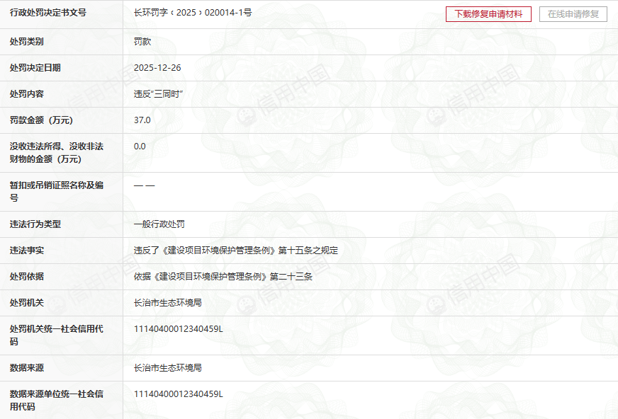 2025年12月26日,长治市生态环境局发布行政处罚决定书(长环罚字﹝2025﹞020014-1号),山西霍尔辛赫煤业有限责任公司因违反环保相关规定,被处以37万元罚款。