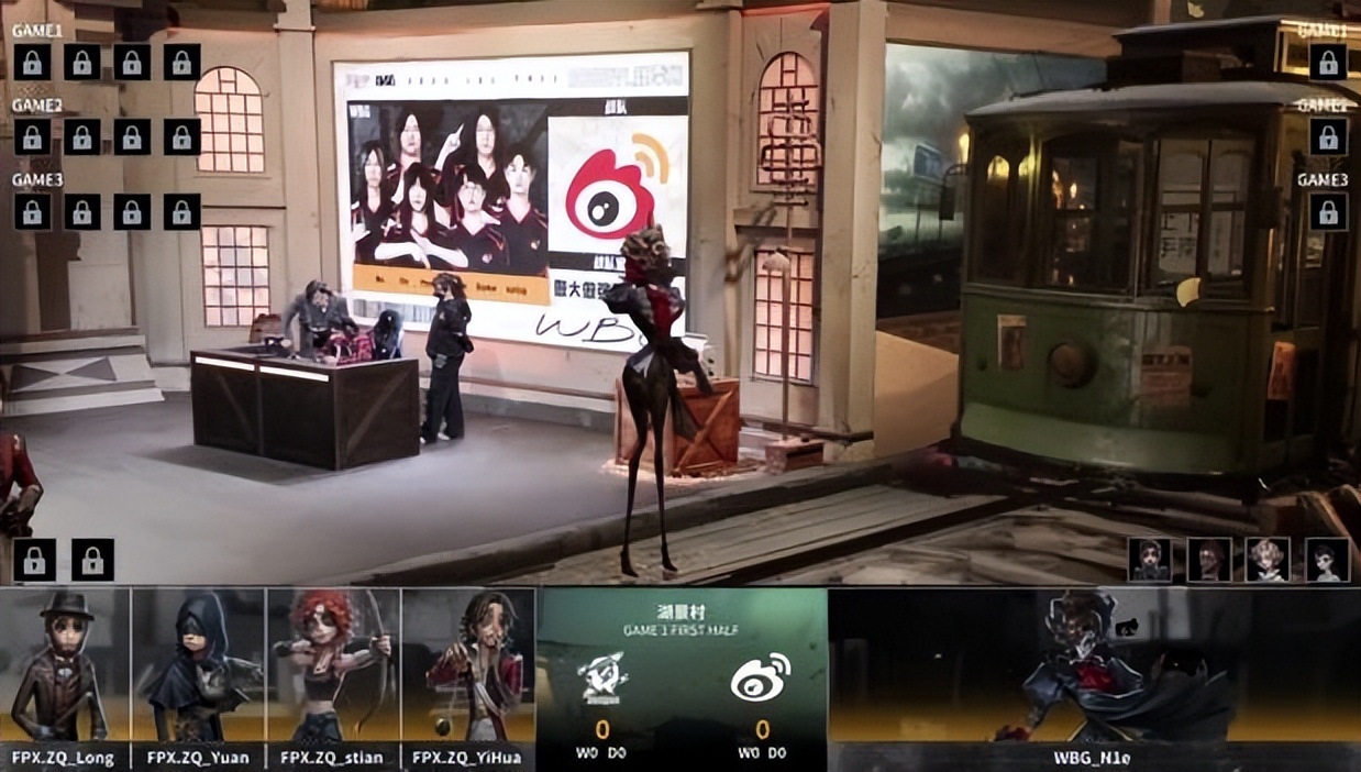 FPX ZQ的求生者选择了飞行家、空军、幸运儿、佣兵(BAN“跛脚羊”);北京WBG的监管者N1e选择了“喧嚣”。(BAN“逃脱大师”、气象学家、古董商、哭泣小丑)
