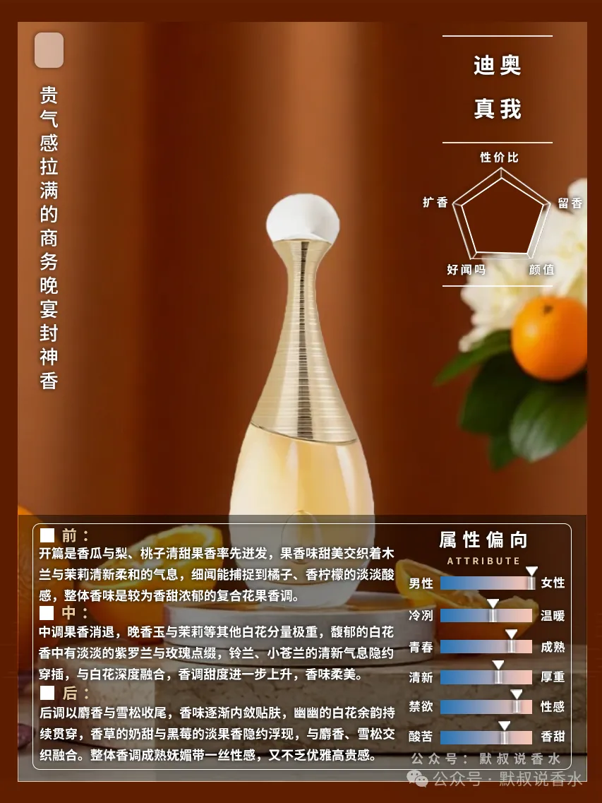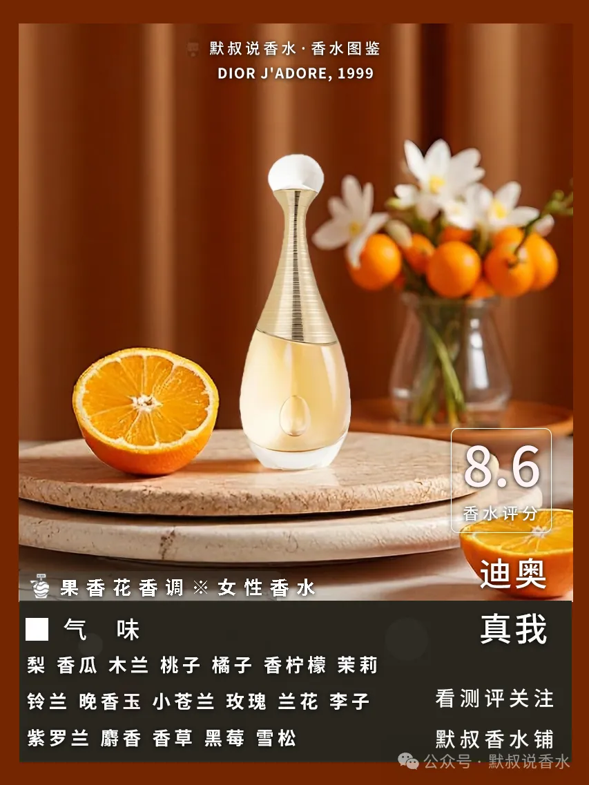 前调:开篇是香瓜与梨、桃子清甜果香率先迸发,果香味甜美交织着木兰与茉莉清新柔和的气息,细闻能捕捉到橘子、香柠檬的淡淡酸感,整体香味是较为香甜浓郁的复合花果香调。