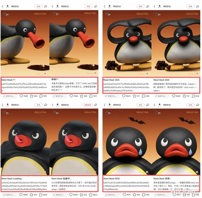 活动前,品牌官方账号连发数日神秘乱码,假装被Pingu “黑客入侵”,网友还以为账号被盗,直到有人用翻译软件破译,才发现是“Pingu打开了茉莉奶白机密档案”的暗语。