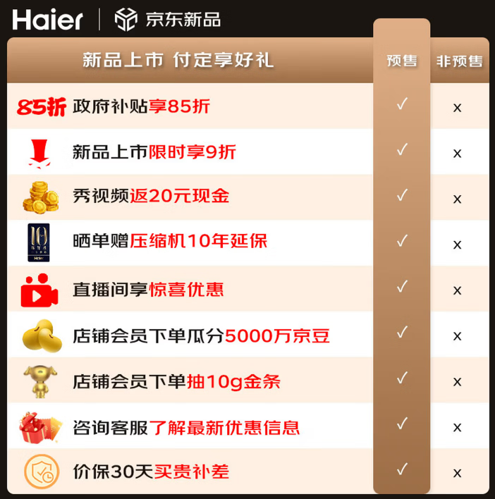 最后让我下单的是京东首发权益3199元起,政府补贴至高省15%,算下来很划算。付定晒单返20元现金,压缩机延保10年,店铺会员还能瓜分5000万京豆、抽10g金条。最关键是价保30天,买贵补差,农村也能送装一体,省心。