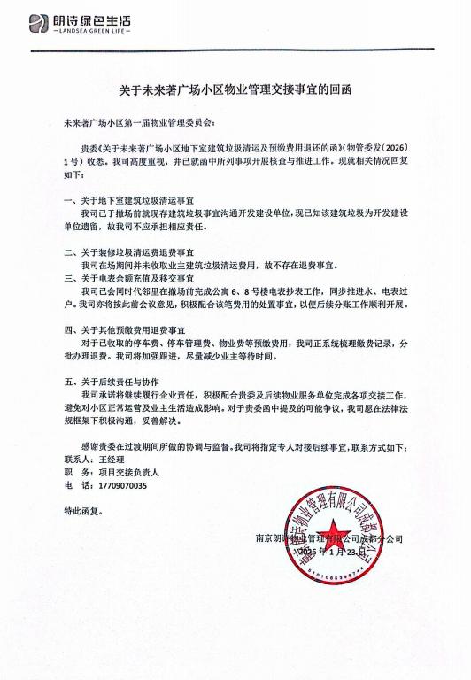 贵委<<关于未来著广场小区地下室建筑垃圾清运及预缴费用退还的函>(物管委发(2026)1号)收悉。我司高度重视,并已就函中所列事项开展核查与推进工作。现就相关情况回复如下:
