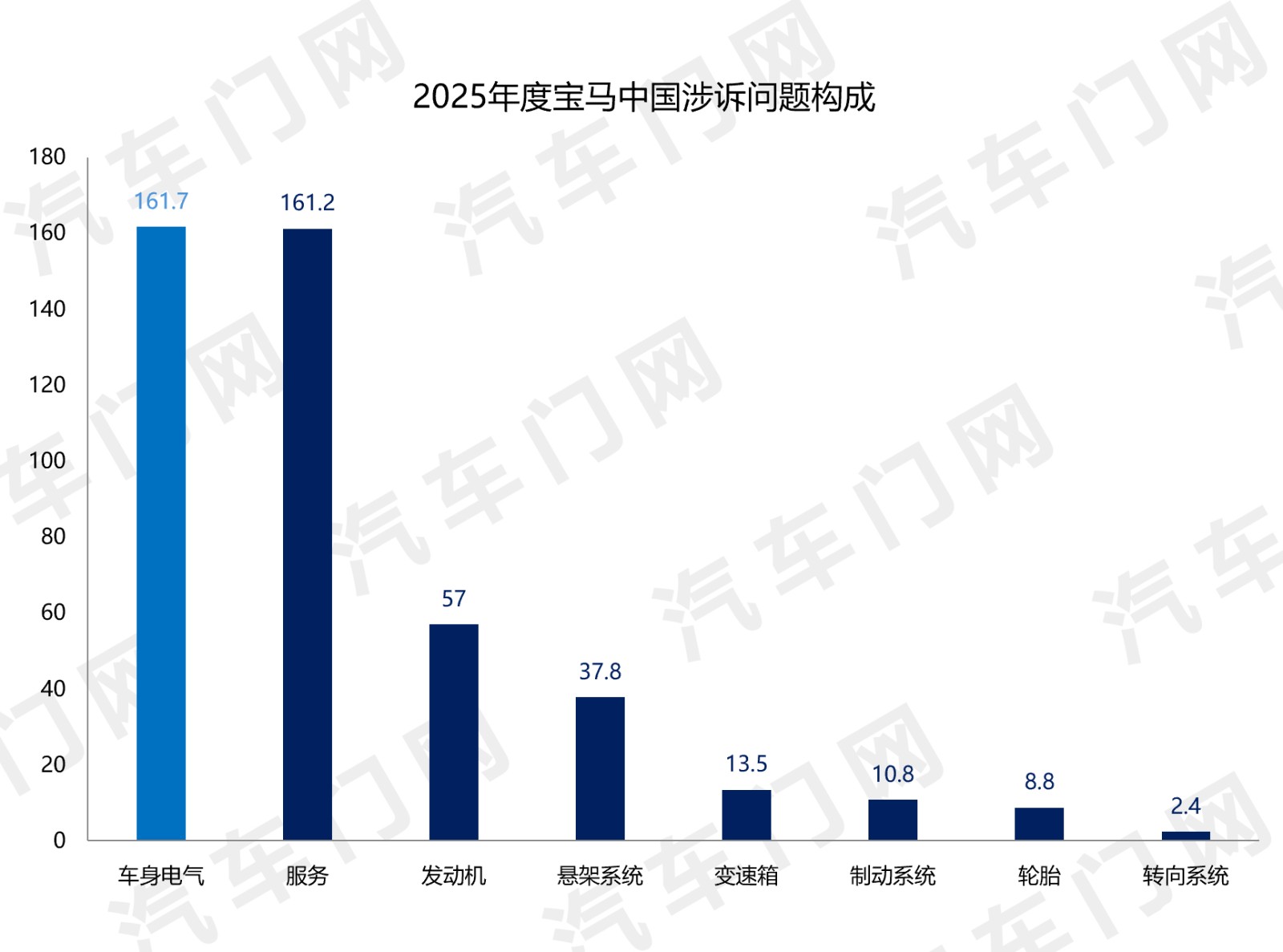 从投诉问题分类来看,宝马中国的主要问题集中于通常的投诉大户——车身电气和服务两个方面。除此之外,发动机问题投诉和悬架系统问题投诉合计占到了宝马中国整体投诉的21%。