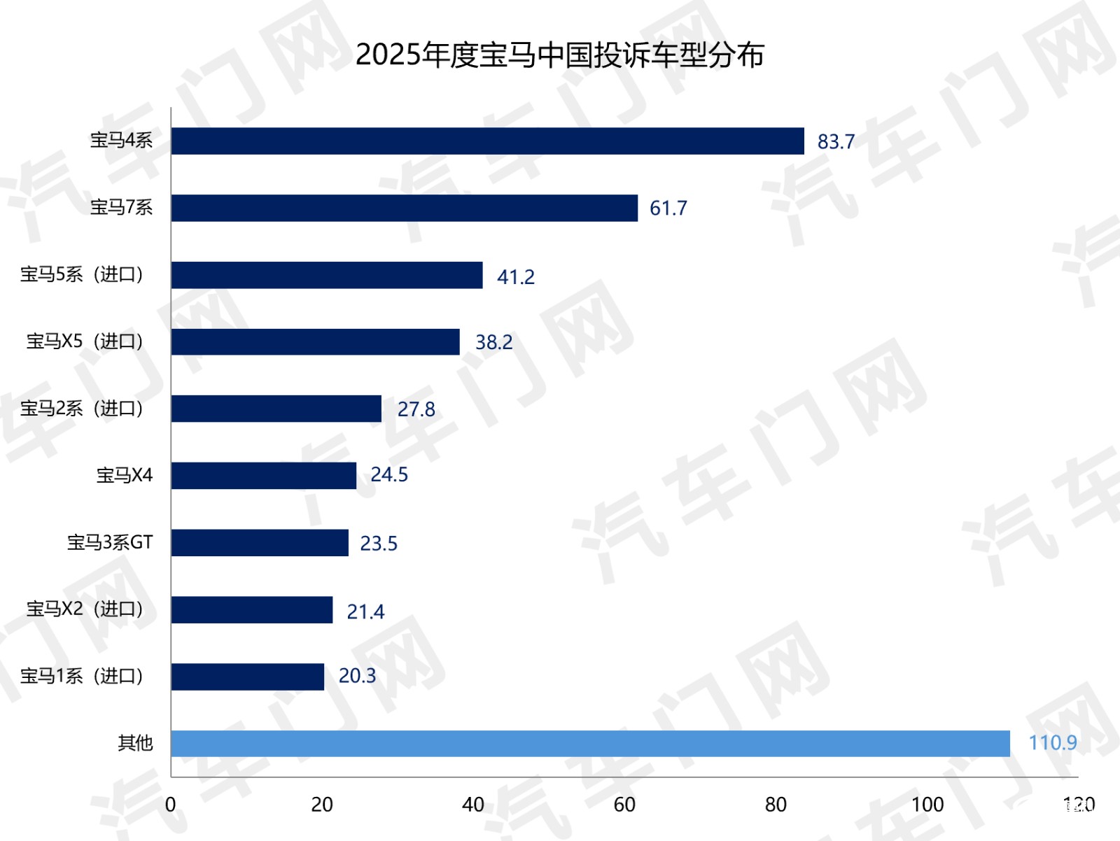 从车型分布来看,宝马4系是宝马中国的重点投诉车型,投诉指数达到了83.7,占其整体投诉指数的18%。宝马7系、宝马5系(进口)、宝马X5(进口)也是车主投诉比较多的车型,合计投诉占比31%。