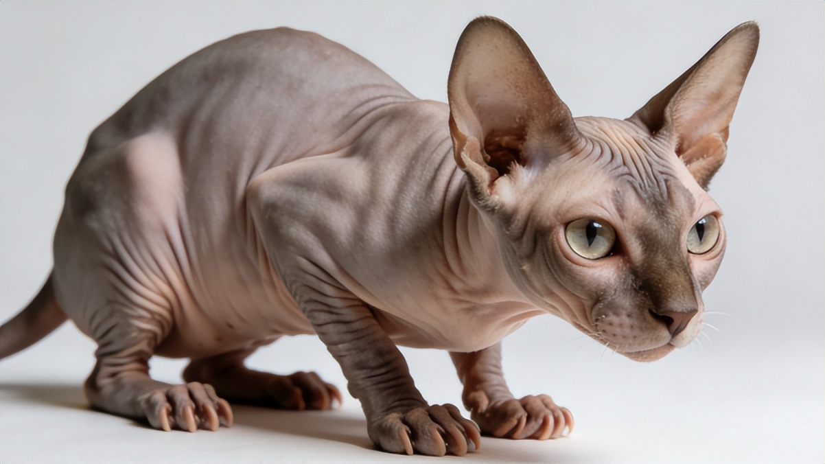 属中型偏瘦体型,成年公猫体重 3-5 公斤,母猫 2.5-4 公斤,体型呈 “修长流线型”—— 身体纤细,胸部窄而深,背部平直,腰腹部紧致,整体轮廓如同拉伸的东方短毛猫。四肢修长且肌肉发达,后肢略长于前肢,骨骼轻盈但坚韧,跳跃高度可达自身身高 4 倍,行走时步态轻盈迅捷,尽显灵动特质。足掌呈椭圆形,趾间带有明显蹼状结构(区别于其他无毛猫的关键特征),行走时落地无声,保留了捕猎者的隐蔽性。
