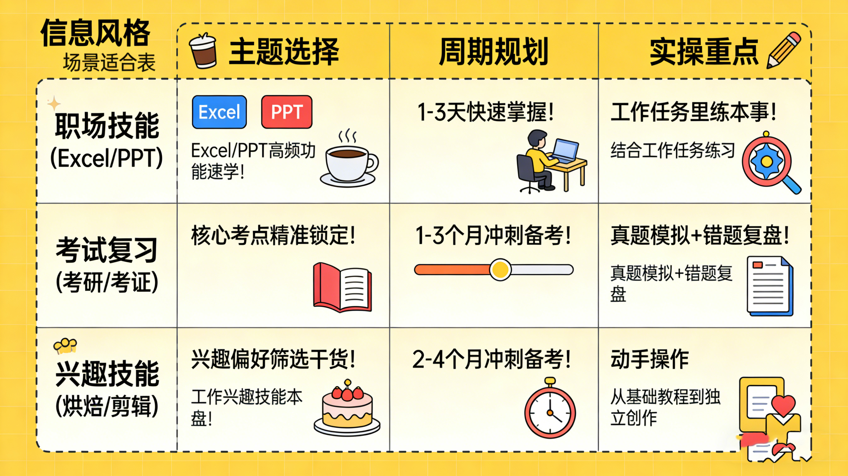 基础方法通用,针对不同学习场景调整细节,能让主题轰炸的效果最大化,适配不同人群需求:
