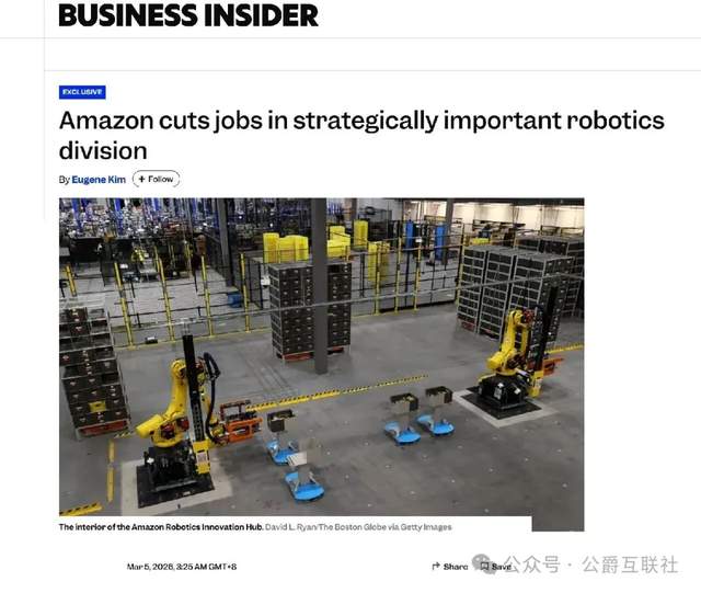 2026年3月,亚马逊证实,旗下机器人部门迎来新一轮裁员,至少上百名研发、项目管理类岗位被裁撤。而就在不久前,该部门的核心项目Blue Jay多机械臂系统,还作为亚马逊仓储自动化的未来重点,在公开活动中亮相宣传。如今项目直接终止,团队随之解散,反差之大,令人唏嘘。