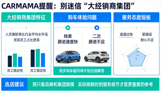 CARMAMA提醒,别迷信“大经销商集团”,规模大不代表体验好。经销商集团靠着严格管理,人员离职率比行业平均水平低,资深员工占比也更高,但这份稳定性并没转化为更好的购车体验。集团门店虽然线索跟进速度快,却存在二次跟进不足的问题,很多你的购车疑问得不到后续解答;更关键的是,线索压力下,集团销售的服务态度短板凸显,要么语速过快,要么爱插话,对客户的耐心明显不足,头部经销商集团的这个问题更严重。说白了,选4S店别只看品牌和集团规模,实际接触时的服务细节,才是更重要的参考。