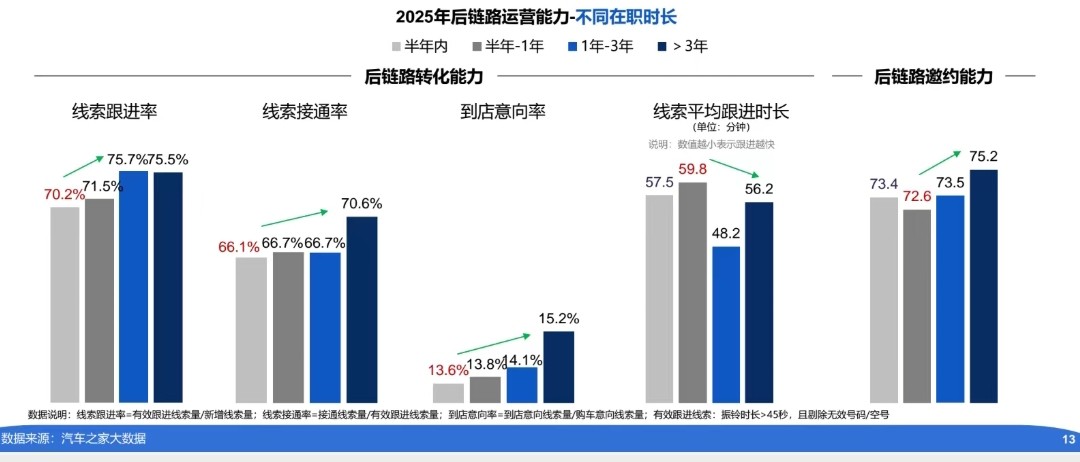 销售在职时间,直接决定了你的购车跟进体验,这是CARMAMA从数据中找到的核心关联。后链路运营(即从留资到店试驾的全流程跟进服务)能力和销售在职时长高度相关:入职半年内的新人,虽然回复消息快,但流程执行一塌糊涂,线索跟进的关键环节总漏做;工作半年到三年的销售,容易出现职业倦怠,专业度和服务态度双双下滑;