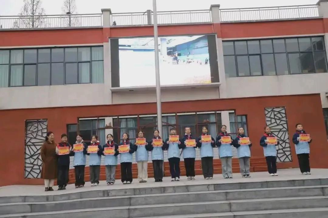 在周一的升旗仪式上,朝阳为奖状镀上金色,掌声为少年奏响赞歌。王校长为获奖小选手颁发了奖状并合影留念。