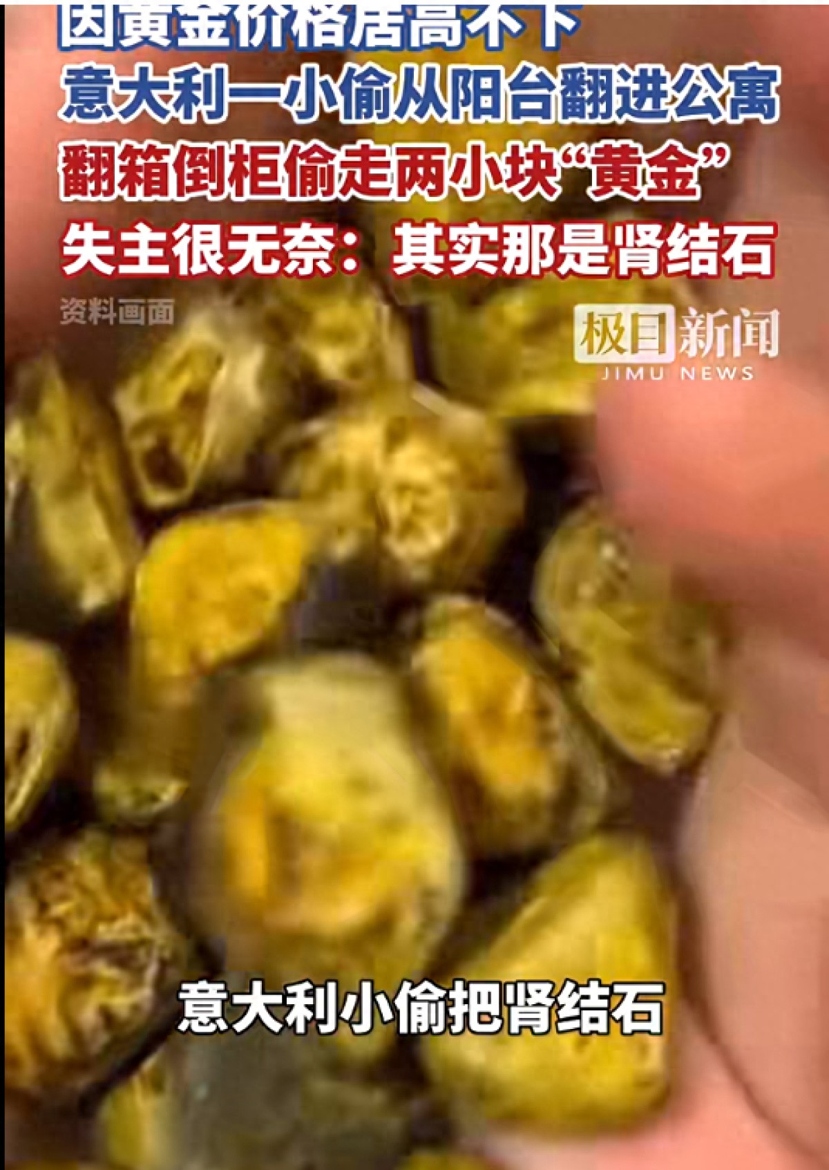 潇湘晨报综合报道,因黄金价格居高不下,意大利一小偷近日闯入某公寓,偷走了两小块用盒子装着的“黄金”,失主对此无奈地表示,其实那是肾结石。