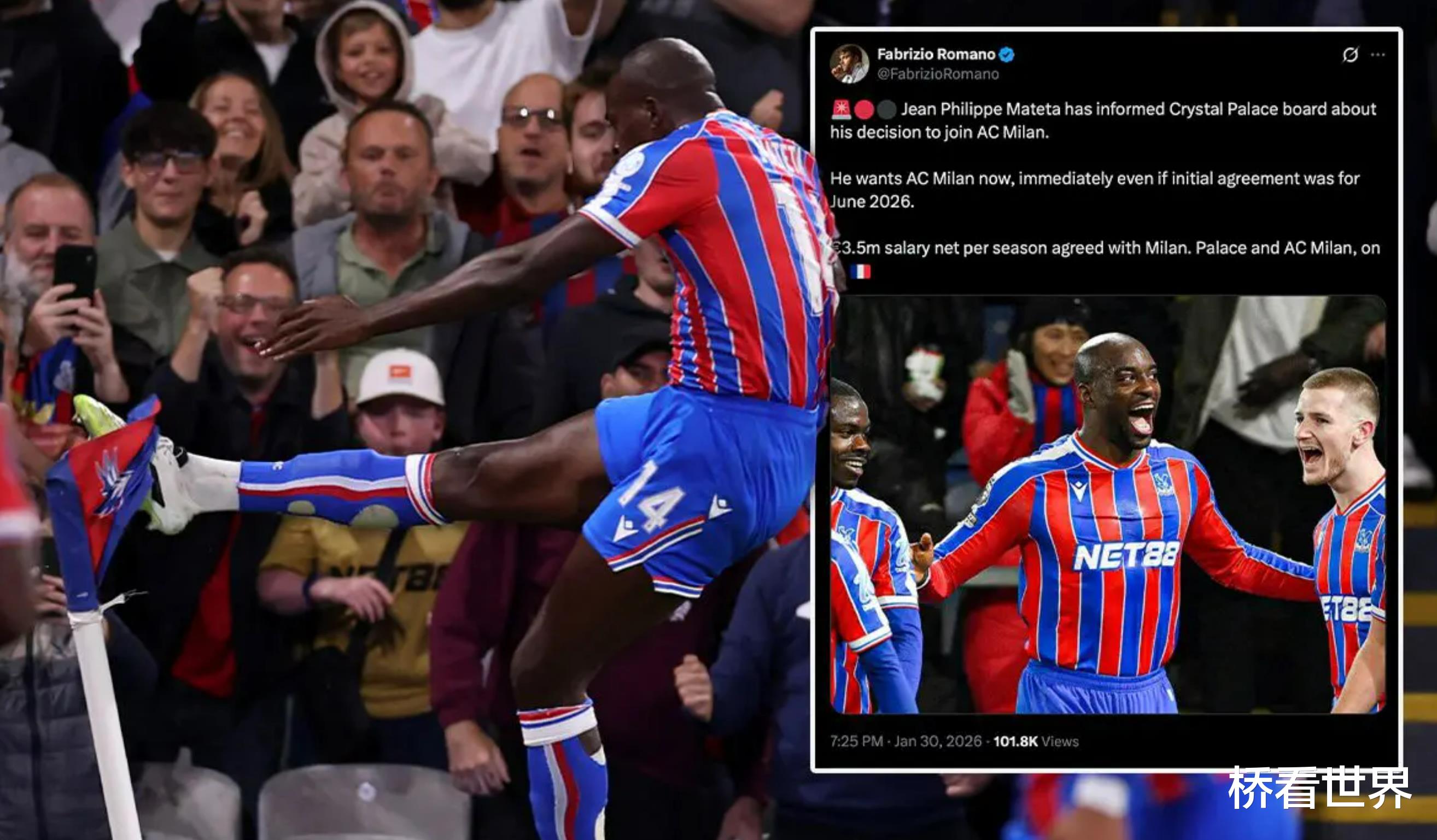 罗马诺在社交平台中写道:“让-菲利普·马特塔已向水晶宫董事会明确表态,他决心加盟 AC 米兰。 尽管双方最初达成的协议是 2026 年 6 月转会,但球员本人希望立刻披上红黑战袍。他与AC米兰已就税后 350 万欧元的年薪达成一致。水晶宫与AC米兰正就此展开最终磋商。”