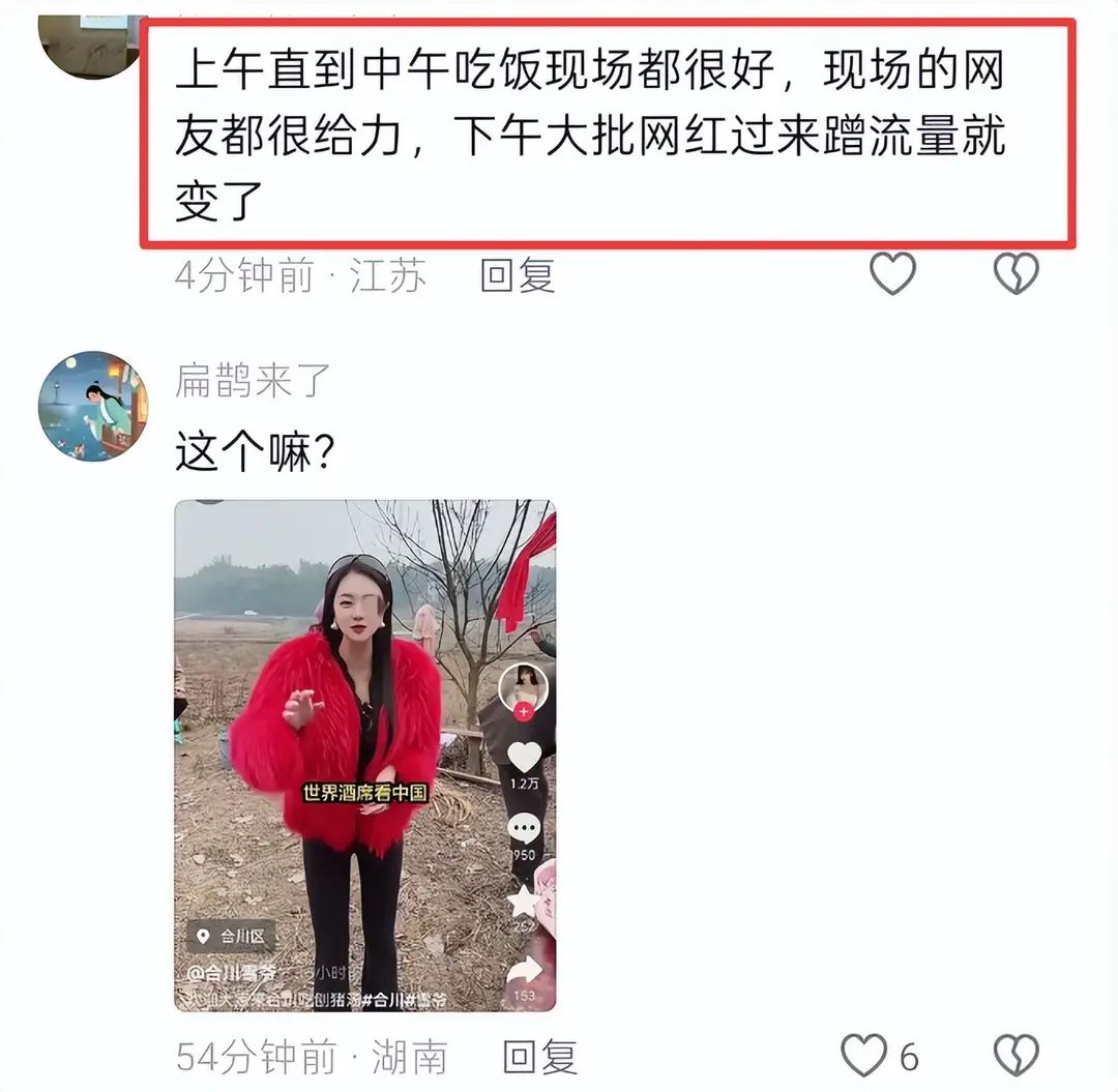 呆呆因为这场刨猪宴,短短两天,涨粉100多万,直播间人气10万+,有些网红嫉妒坏了,跑到现场阴阳怪气,其中有一位红色大衣的女网红,格外让人反感。