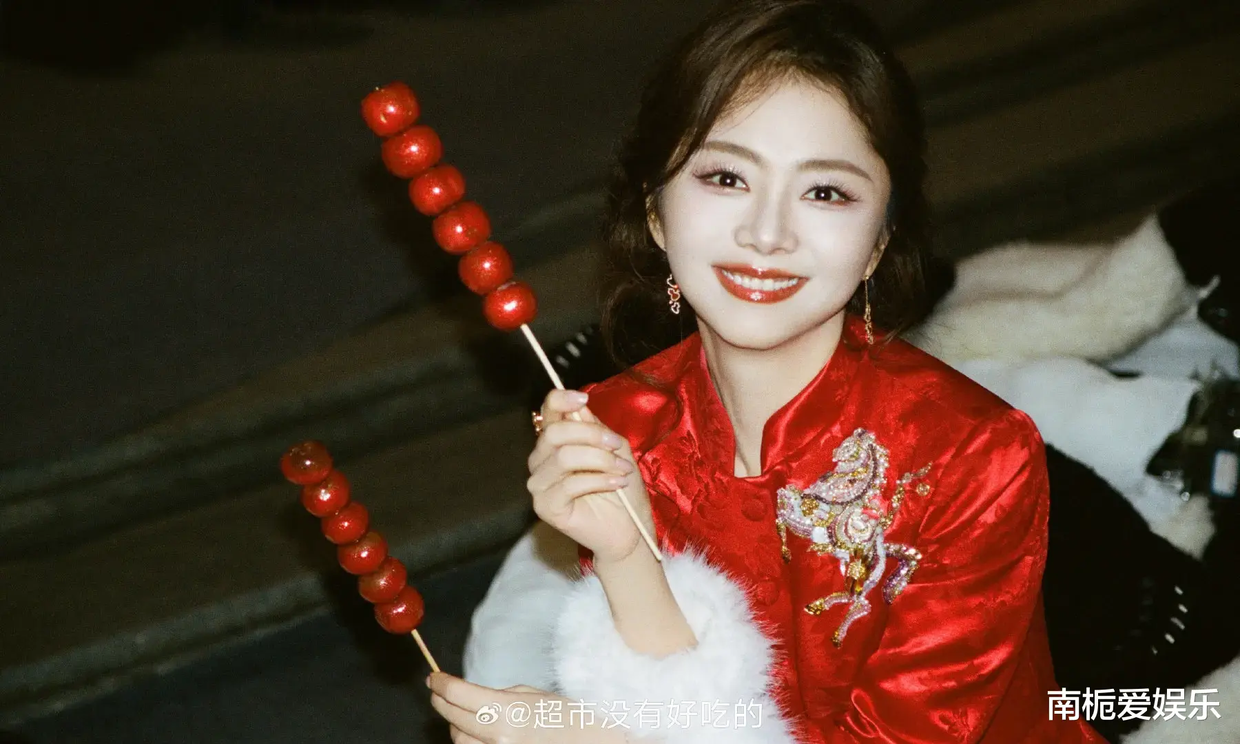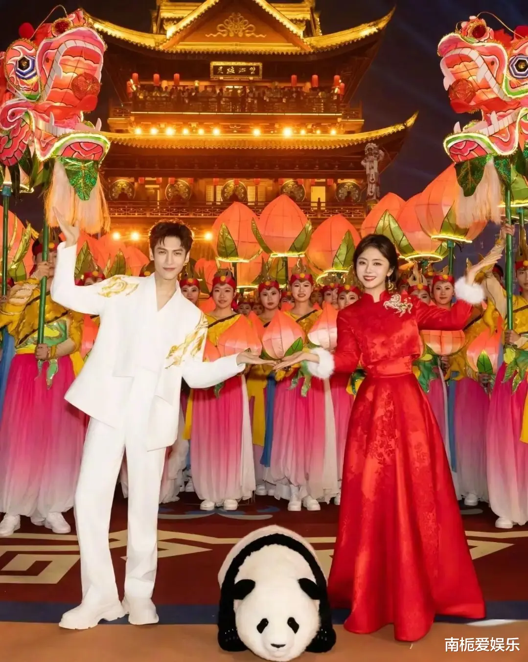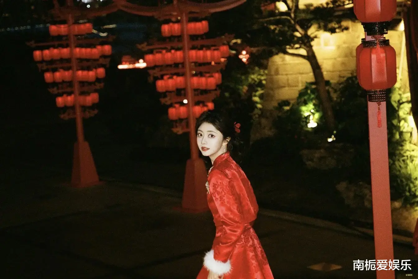 罗云熙一袭白色长袍尽显清贵公子气,衣襟上金色骏马纹样采用非遗蜀绣工艺,配合皮影戏皮质材料的立体装饰,将马年元素与巴蜀文化完美融合,仿佛把“非遗博物馆”穿在了身上。谭松韵化身“福气娃娃”,红色中式礼服喜气洋洋,胸前的亮片马形装饰灵动可爱,配上标志性的梨涡浅笑,被观众盛赞为“自带滤镜的治愈系天花板”,瞬间拉满了新春的团圆氛围。