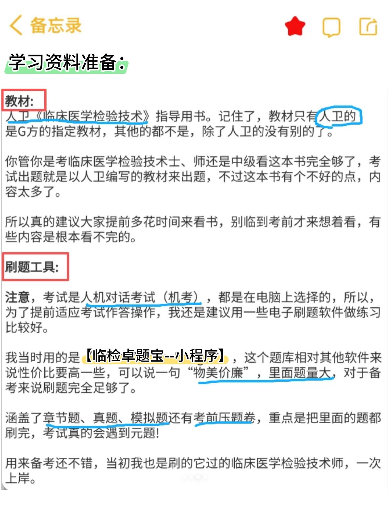 二、教材 + 题库同步走,拒绝 “假努力”“只看书不做题 = 白学,只做题不回教材 = 记不牢”,这是备考的两大误区。正确的节奏是教材与题库双向绑定,我自用的高效组合是「教材 + “临检卓题宝”小程序题库」,适配考纲、贴合考点,直接省去筛选资料的时间。