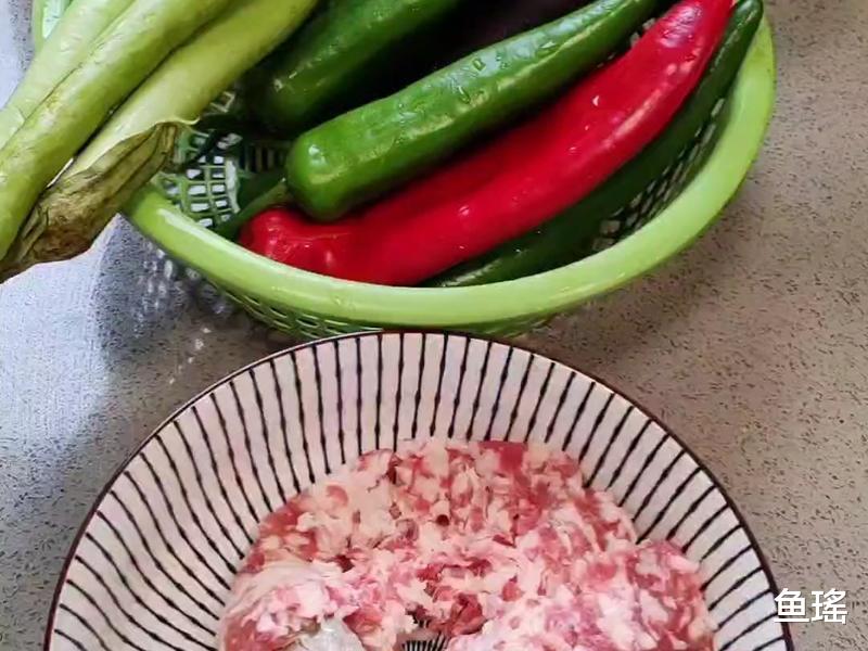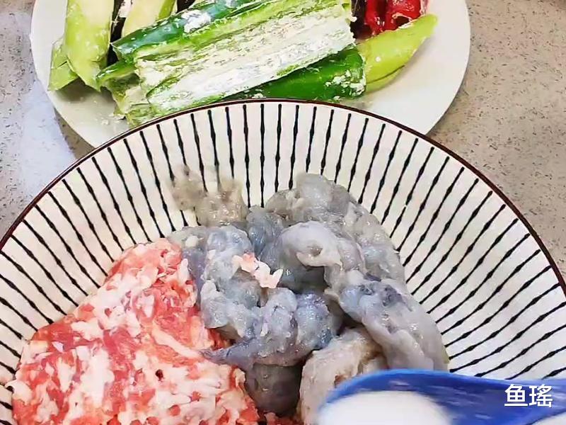 先说“选角”。青椒挑“胖灯笼”——身形饱满、肉厚不辣,切3cm宽圈,用牙签轻轻挑掉白筋,防止“辣素炸弹”;茄子选“紫袍长条”,斜刀切2cm厚片,中间再划一刀别切断,像给茄子做“口袋”;豆腐用“北方卤水硬汉”,切4x6cm大方块,厚度2cm,中间用勺子挖个“小船舱”,挖出来的碎豆腐别丢,丢进肉馅里当“天然嫩肉粉”。肉馅统一配方:三七肥瘦猪肉末150g + 虾仁末50g(增弹)+ 碎豆腐50g + 盐0.5g + 白胡椒 + 生抽1勺 + 香油0.5勺,顺时针搅到“起黏拉丝”,像给肉馅做“健身操”,再摔打10下,把空气赶出去,后面才不会“散花”。
