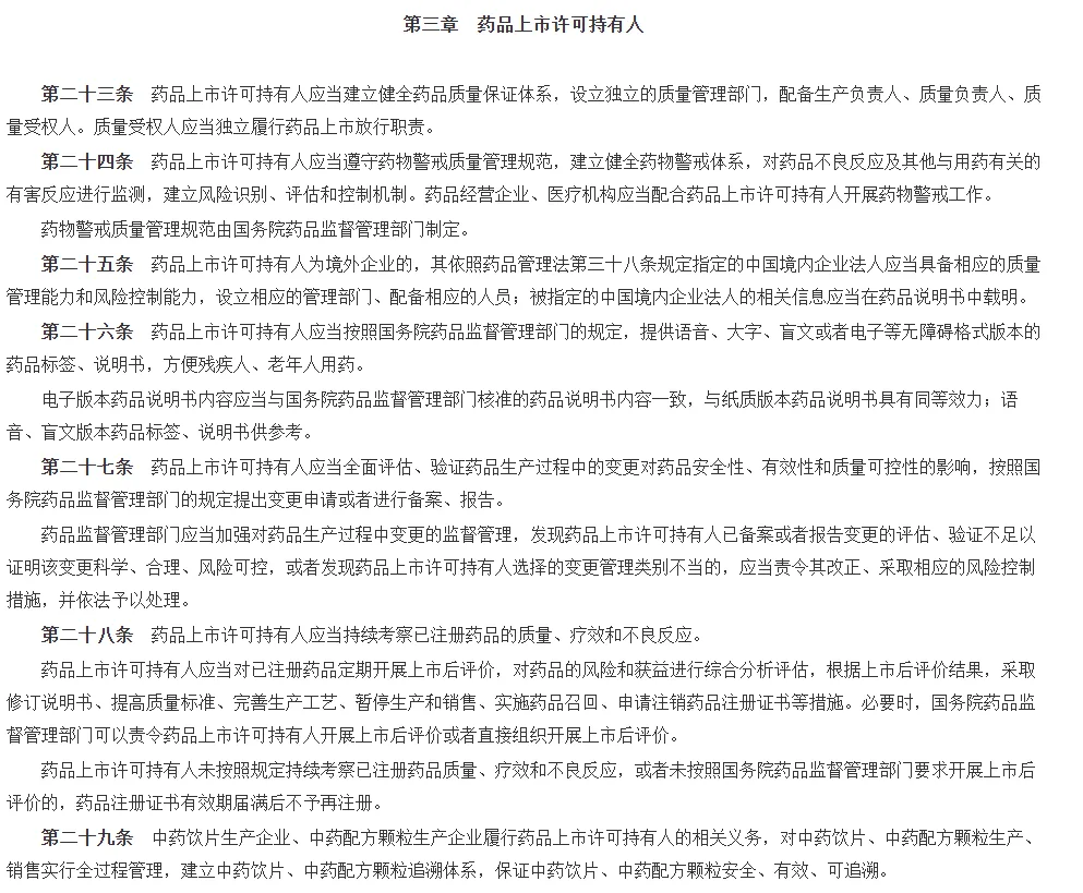 与之不同的是,新《条例》彻底打破了原有的框架模式,按照“研制→注册→MAH→生产→经营→使用→监管”这一药品全生命周期的流程来划分章节。值得一提的是,新《条例》首次专门设立了“药品上市许可持有人”一章,将监管的重心从过去单纯的“事前审批”转移到了“全程追责”。