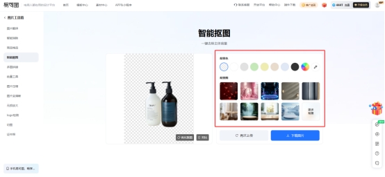 第二步,系统默认输出的是透明背景图片,如果你需要白底图或者场景图,可以在右侧选择颜色或背景模板,一键替换。