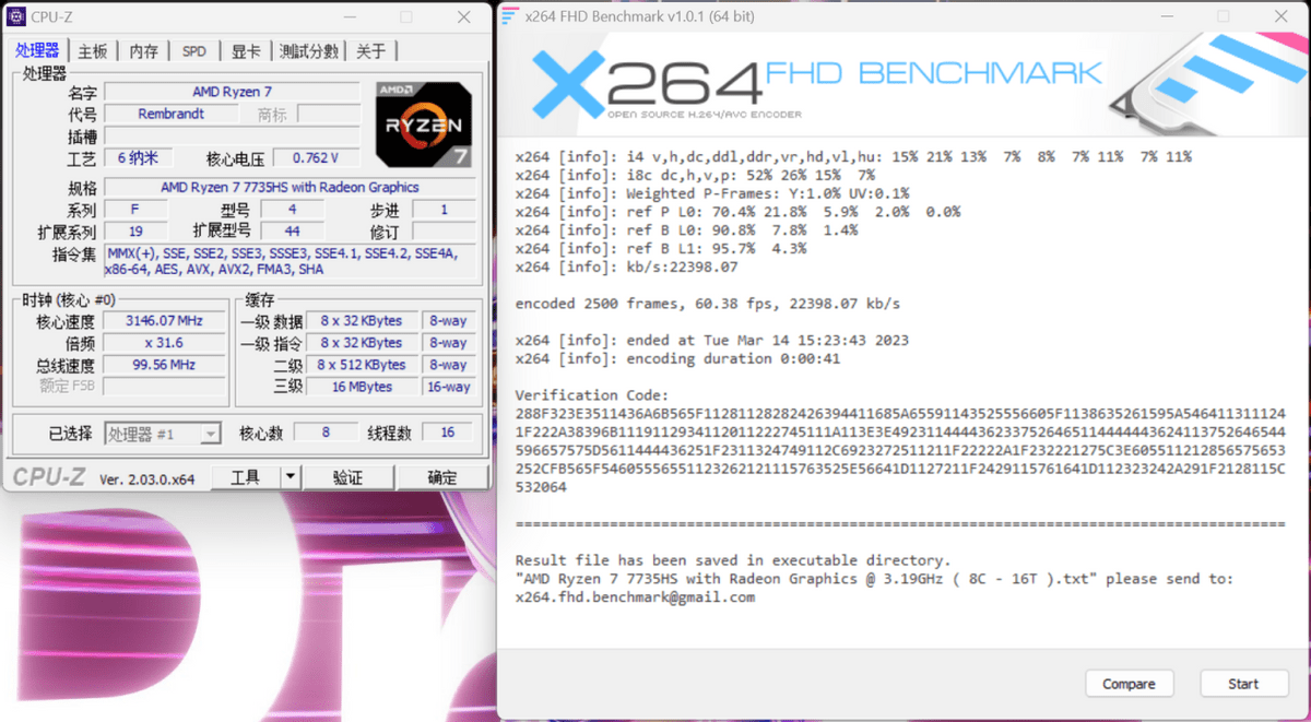 在X264 FHD Benchmark测试下,R7 7735HS编码完成用时仅41秒。