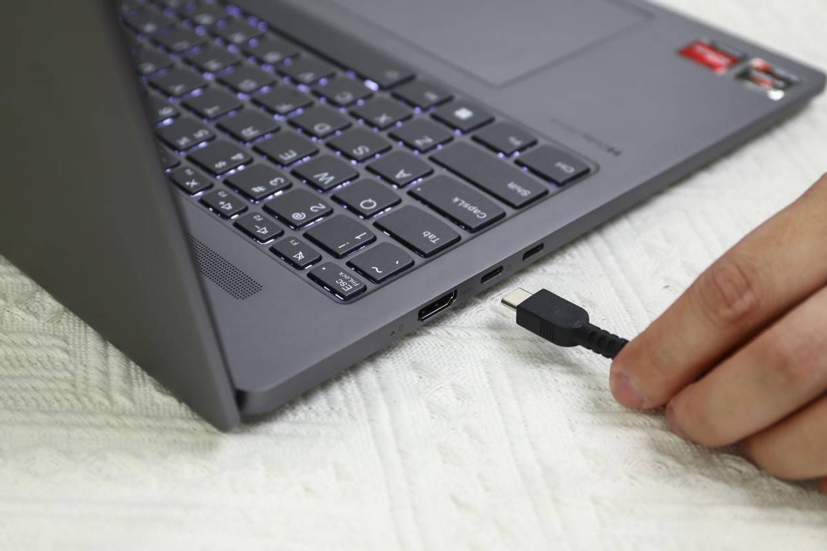 接口方面就更加齐全了,小新Pro16左侧三个接口为USB4、全功能Type-C、HDMI 2.0,双C口支持至高100W PD快充(私有协议快充可达140W),USB4接口速度可达40Gbps,支持8K@60Hz画面输出,这两个接口可以满足工作的绝大部分需求;右侧接口为USB-Ax2、耳麦二合一3.5mm、SD读卡器。