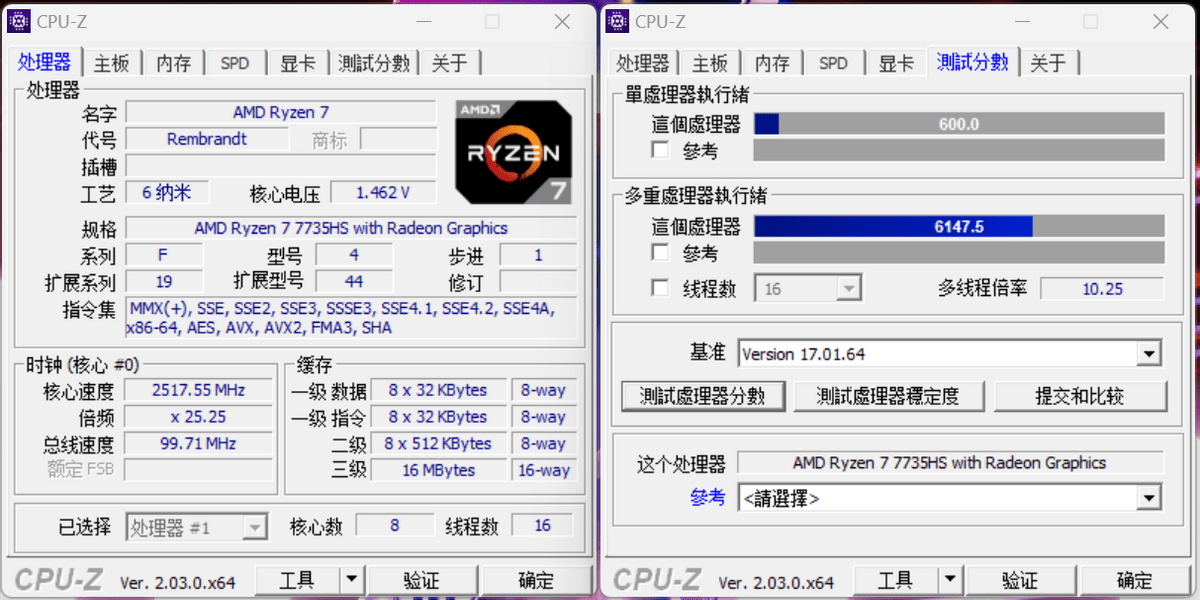 小新Pro16搭载AMD锐龙R7 7735HS,CPU-Z理论测试分数为单核600分,多线程6147.5分。