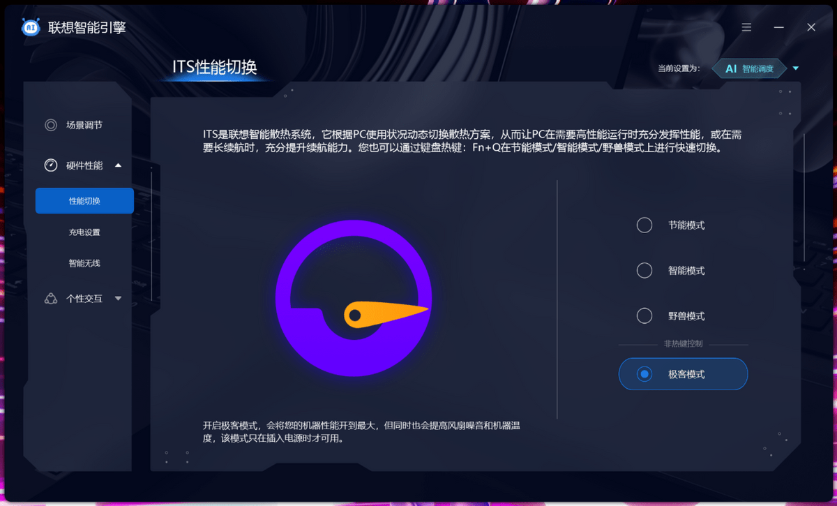 还可以通过Fn+Q功能键自由切换节能模式、智能模式、野兽模式,“老三样”无需多谈,新款小新Pro 16还新增了极客模式,在插电时榨出更多性能。