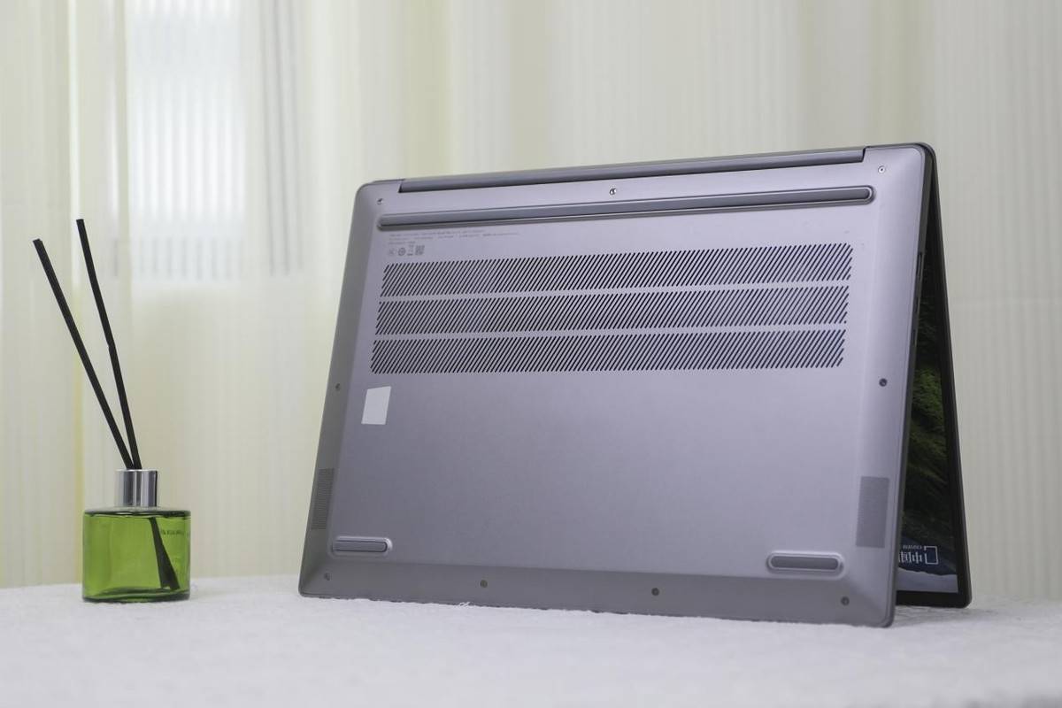 再看看笔记本底部,透过散热格栅可以隐约见到里面的“Anemoi风神”散热系统,由双涡轮风扇和双热管组成,加上键盘辅助进风,在狭小的空间内组成了风道,难怪可以支撑65W的持续性能释放。