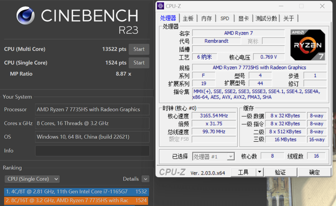 锐龙R7 7735HS在CineBench R20软件的跑分成绩为单核1524分,多核13522分。