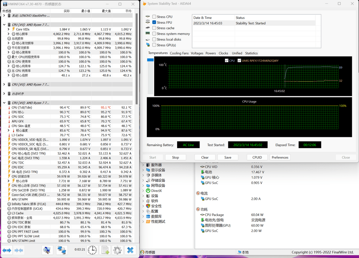 在前面的理论测试和游戏测试中,小新Pro16可以保持约65W的性能释放,用AIDA64进行FPU极限负载单烤10分钟后,新款小新Pro 16依然有约60W性能释放,而且R7 7735HS处理器全核频率还能保持约4GHz。