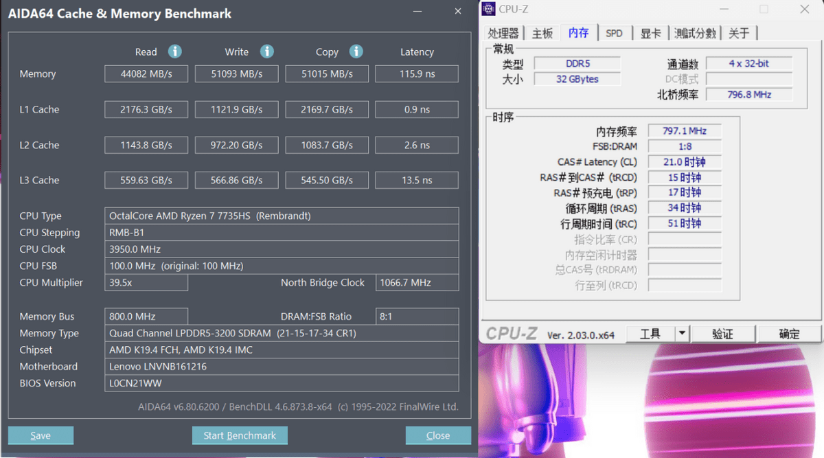小新Pro16采用低能耗的6400MHz LPDDR5内存,有16GB和32GB两个版本可选,本次测试的为32GB版本,时序为21-15-17-34 CR1,读取速度为44000MB/s,写入和复制速度均高于51000MB/s。