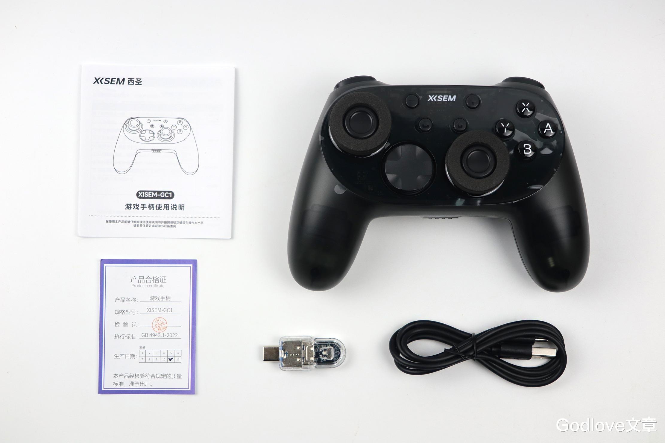 包装箱内部除了西圣GC1游戏手柄还赠送有使用说明书、产品合格证、Type-C 充电线、2.4G 无线接收器。
