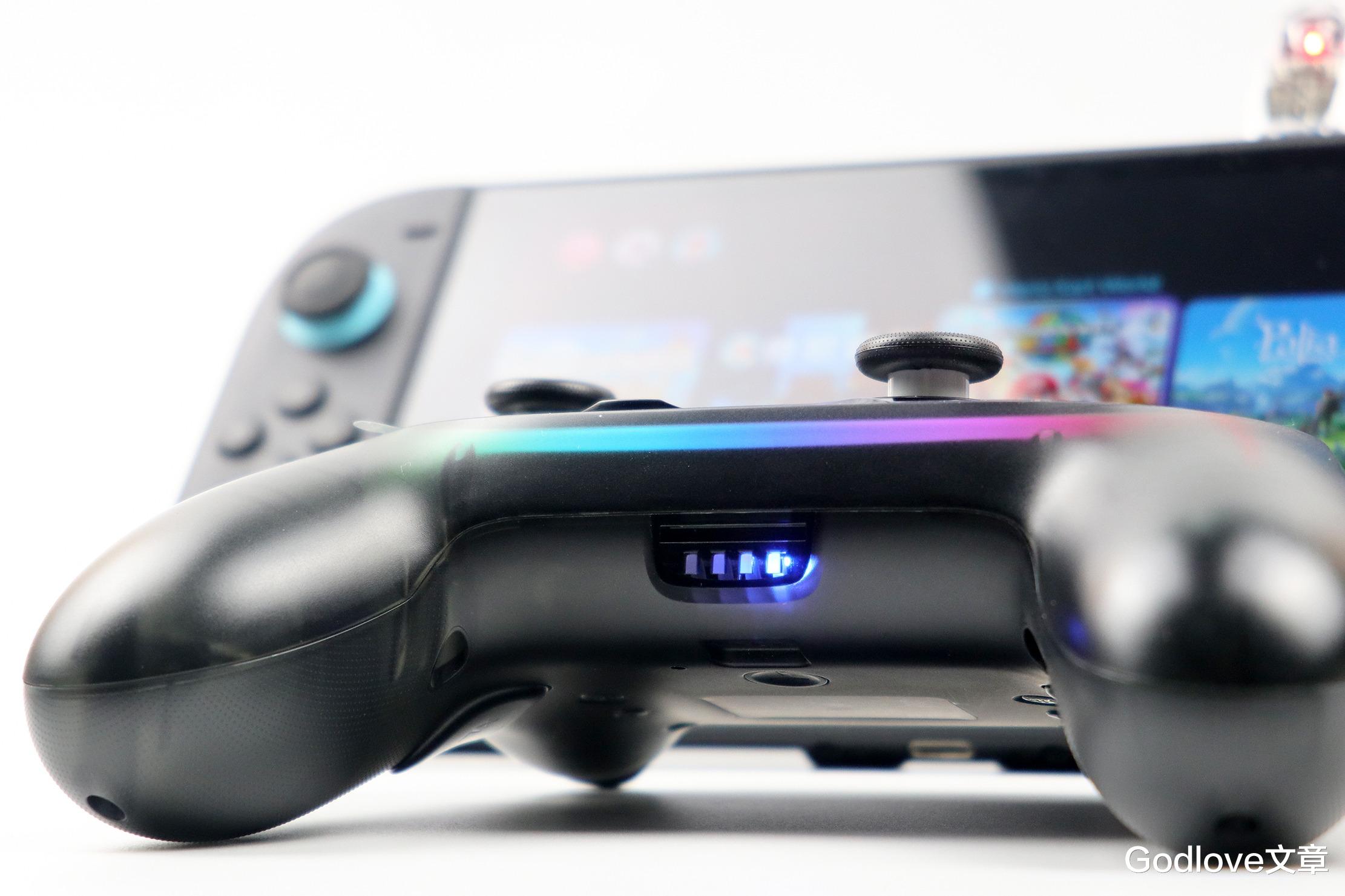 手柄正面在握把中间有贯穿式的RGB氛围灯带,电源开启后能触发打开。搭配 “幻雾晶透” 半透明机身,灯光可透过雾化外壳折射,呈现赛博朋克质感
