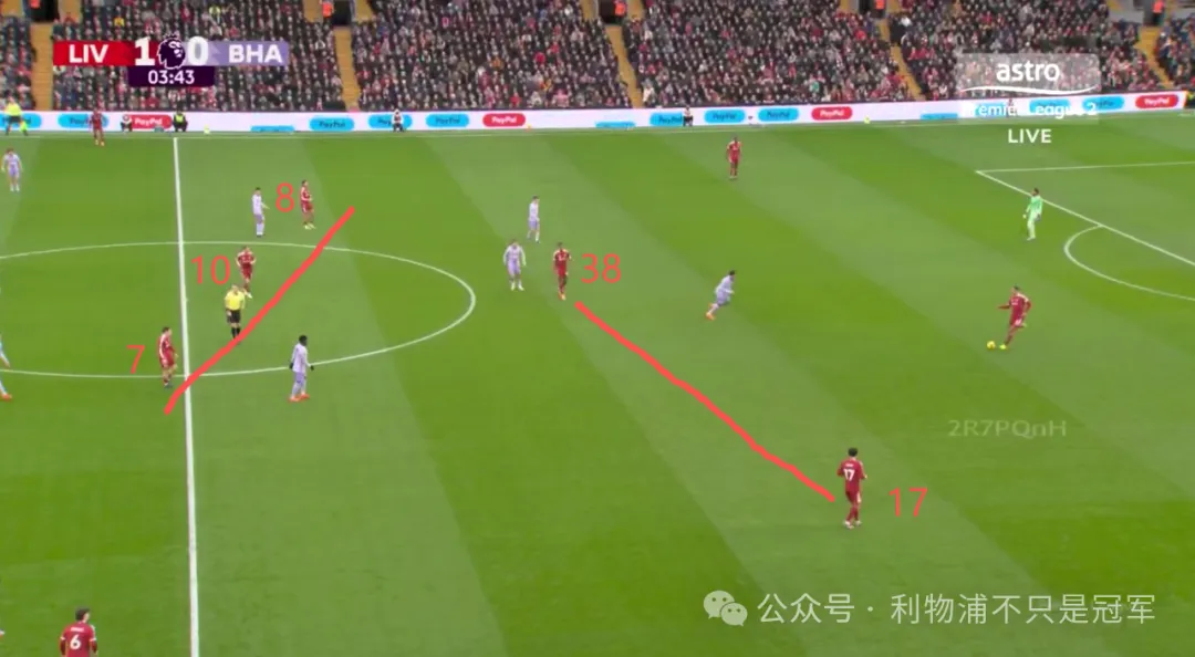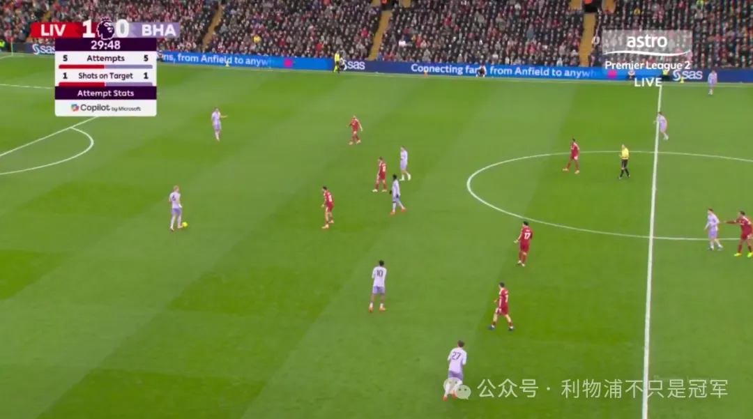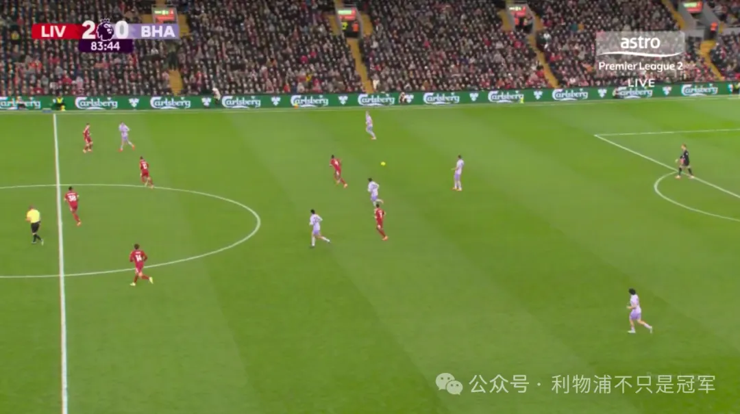 这两人这样使用,避免维尔茨在前场逼抢中的过多跑动和体能消耗,又用麦卡利斯特保证了前场逼抢的力度。两人在攻防转换当中的位置非常灵活多变,让对方更加无所适从。