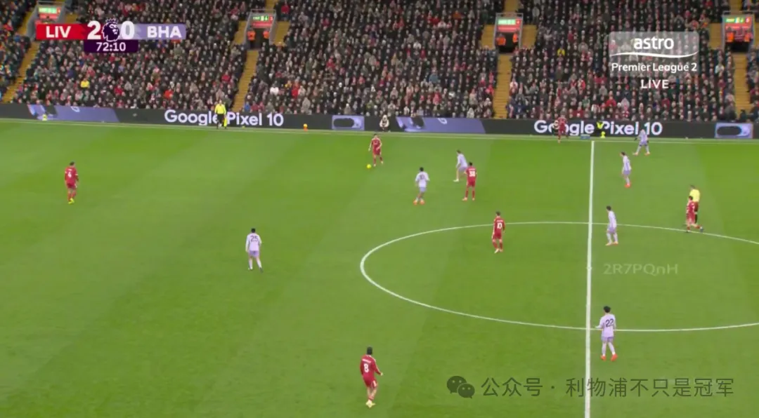 有球进攻时,维尔茨依然前插,麦卡利斯特适当后撤。无论攻防,利物浦的阵型都基本上是433。