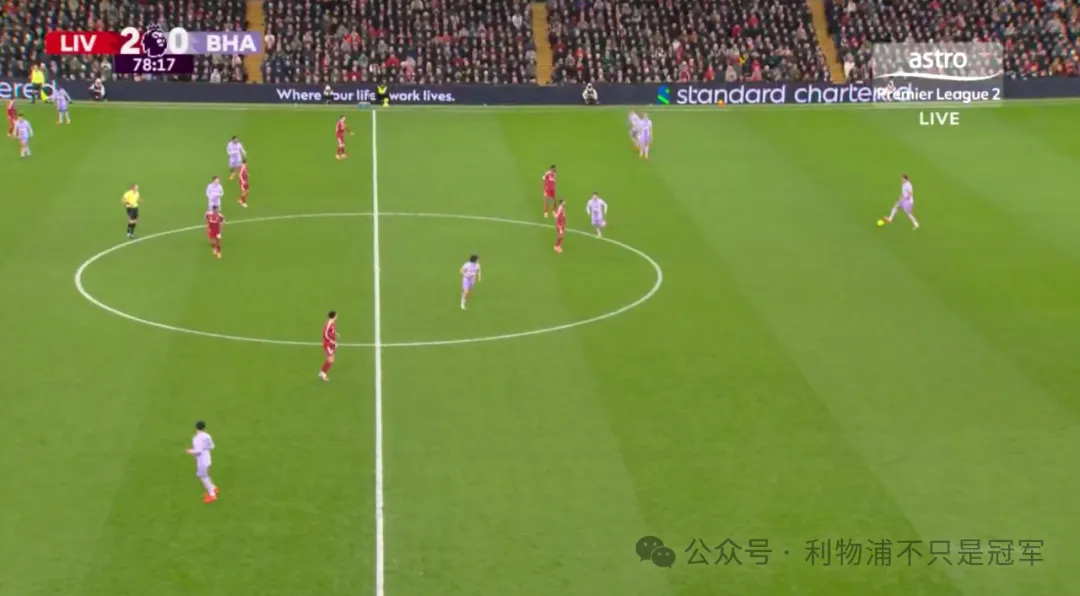 平行站位的四中场保护在四后卫身前,形成两道防守屏障,是此次变阵的主要意图之一。同时,利物浦减少了前场逼抢的投入人数和力度。当时咱们分析过,为什么要这样做?因为当时利物浦处于特殊时期——此前连续三场净负三球共丢10球。先放下强队的尊严,不惜一切代价先扎紧篱笆是当务之急。