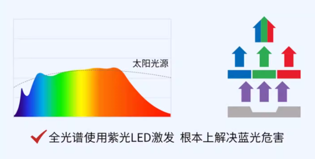 真正的全光谱应无限接近自然太阳光,光谱连续、平滑。在此技术上,更应关注产品是否具备科学补充有益长波红光(如600-700nm)的能力。目前更优的解决方案是采用紫光激发技术,它能从光源端避免产生高能蓝光峰值,并构建更健康的光谱基底,实现从“减少伤害”到“主动养护”的跨越。