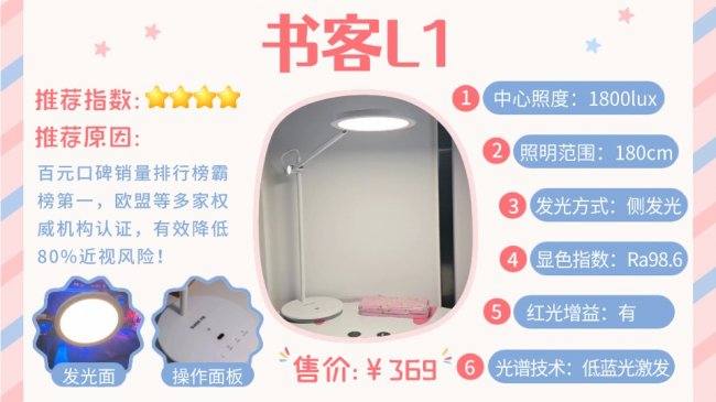 3.书客L1——百元护眼标杆款书客L1是品牌将核心医学护眼技术普惠化的代表作,打破“真护眼必高价”的行业误区,在百元价位实现“平价不降质”,成为学生党与预算有限家庭的宝藏款,长期霸榜百元档护眼灯口碑与销量榜单。品牌背书同样扎实,入选品牌强国自主品牌优选工程,通过欧盟、日本等多国权威认证,延续书客严苛的护眼标准,拒绝为控成本删减核心配置。