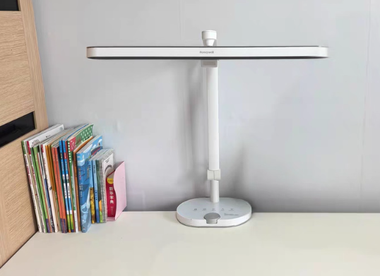 霍尼韦尔A9搭载55cm长灯头与多段可调节灯臂,光线可轻松覆盖1.2米桌面,适配大尺寸书桌日常读写、手工等场景。光源采用全光谱灯珠,显色指数约Ra97,色彩还原精准,看绘本、做手工无明显偏色。操作上融合旋钮与自动感应功能,支持手动调节、环境光自适应调光及入席自动亮灯,无需反复手动操作,使用省心。缺点是灯体体积偏大,占用桌面空间较多,移动灵活性一般;定价高于同级竞品,功能齐全但无突出亮点,护眼策略仅停留在基础合规层面,光谱精细调控不足。