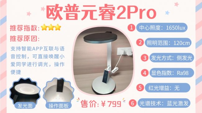 一句话推荐:拥有三分钟“红光”增益,为眼睛输送更多的“营养”;同时拥有OCLT光透镜技术,打造出99.6%还原太阳光的高品质光源,达到护眼更养眼的效果。