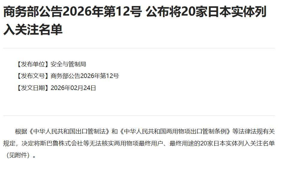 2 月 24 日当天,商务部一口气发布 2026 年第 11 号、第 12 号两份公告,一次性把 40 家日本实体划入管控范围。