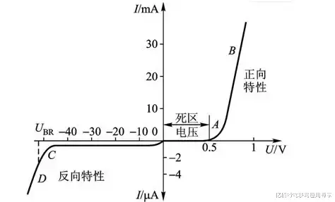 正向特性:当电压超过阈值后,二极管正向电流才会明显增加,流过二极管的电流较大时,电压可以几乎维持恒定,也就是二极管的压降,硅管约0.6-0.7V,锗管约0.2-0.3V。