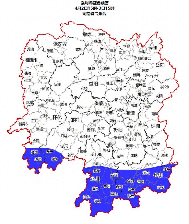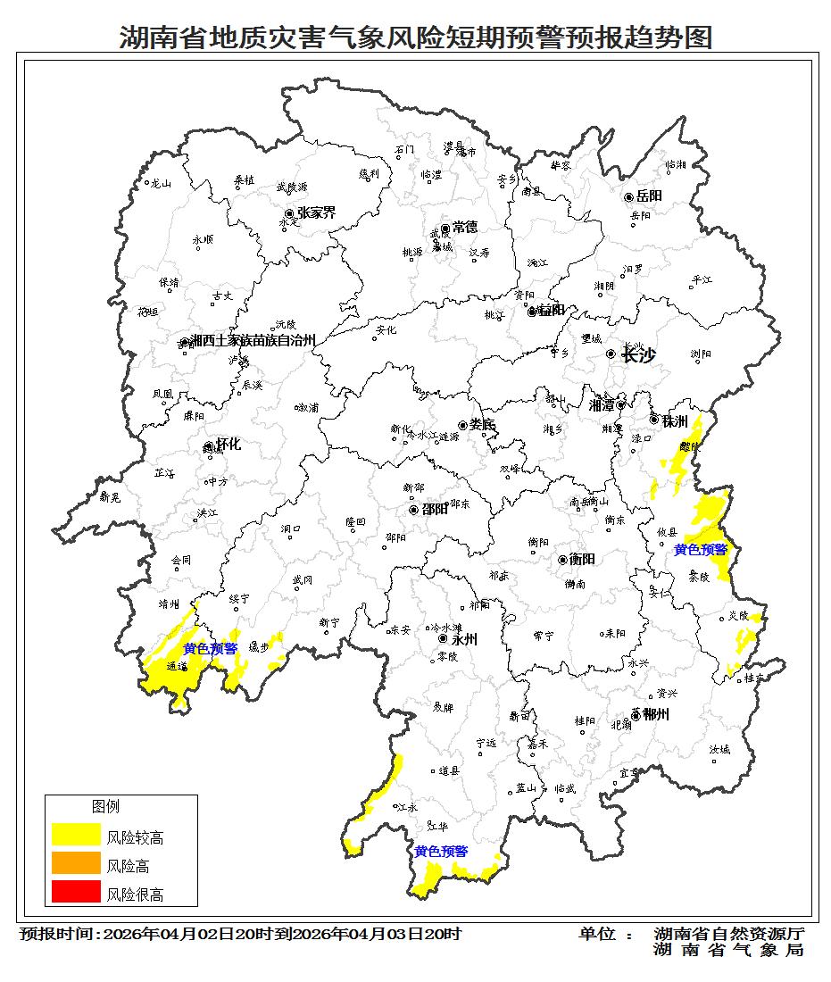 根据地质灾害成灾规律和孕灾条件,结合2026年4月2日短期气象预报情况,省自然资源厅与省气象局联合会商得出如下结论:自4月2日20:00至3日20:00,受降雨影响, 湘东、湘南、湘西南的株洲、邵阳、永州、怀化等市州山地丘陵区发生突发性地质灾害风险较高黄色预警。