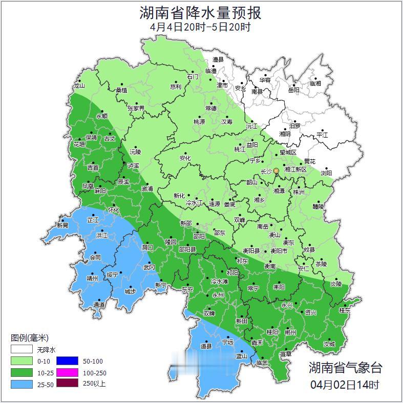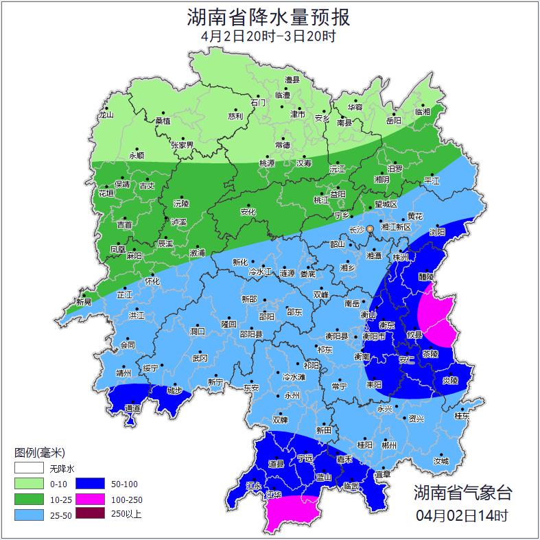 附图1 湖南省降雨量预报图 4月2日08时至3日08时